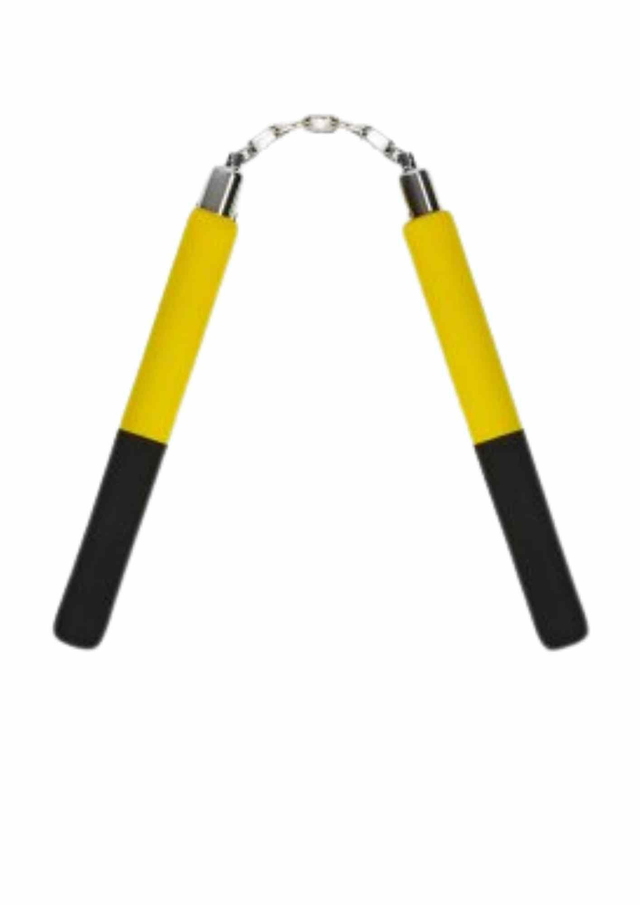 Nunchucks made of foam With Metal Ball Bearing Chain. Two tone half yellow and half black. Diameter of Handles approx 1.2 inches, Length of Handles 12 inches, Length of Chain approx 5.5 inches (7 links in chain).